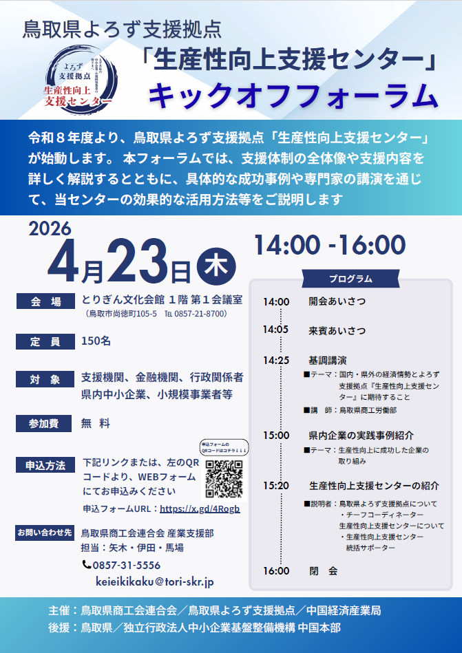 2026年度より、鳥取県よろず支援拠点「生産性向上支援センター」が始動しました。