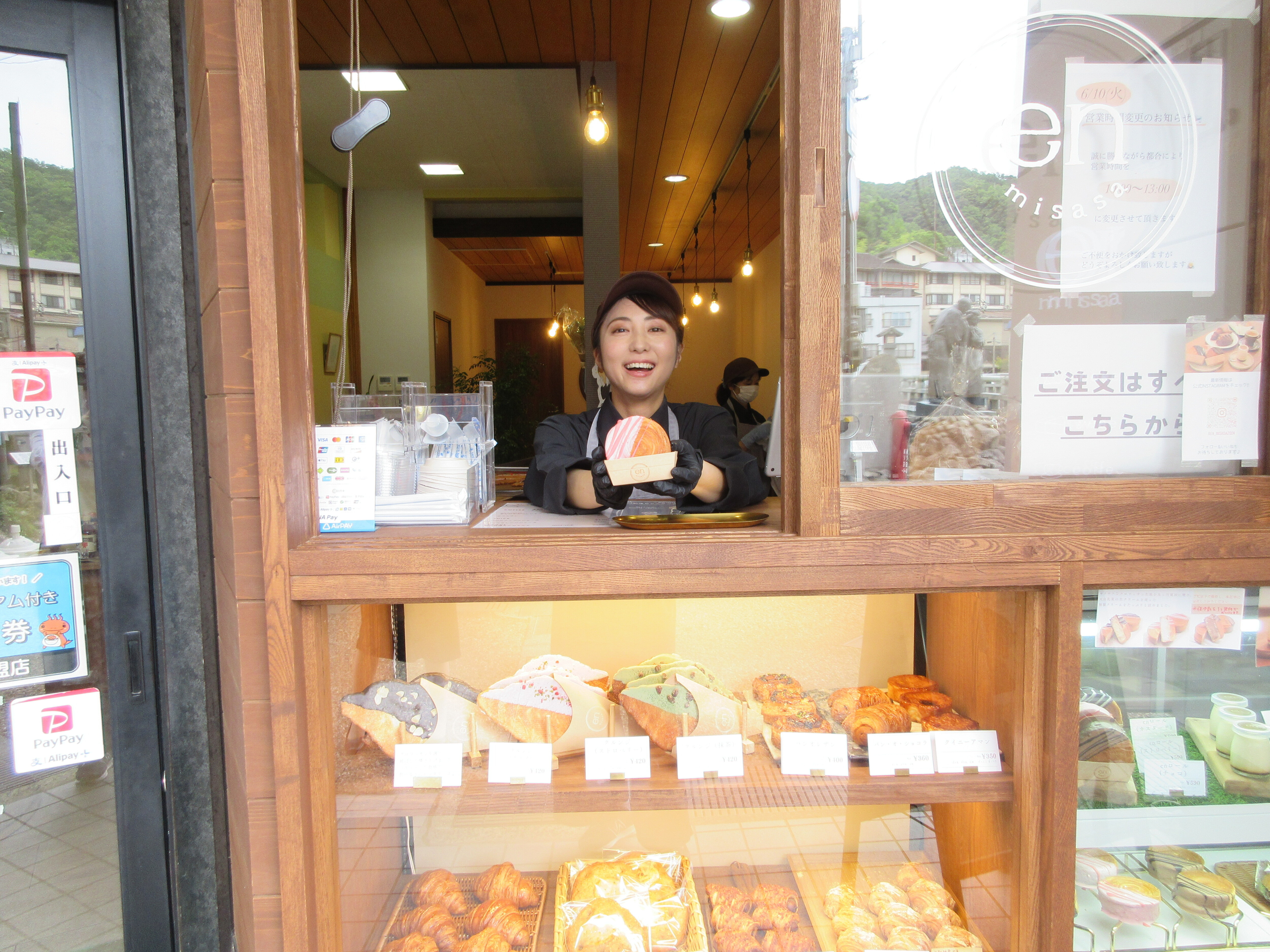起業の経験はなかったため商工会に相談し、事業計画の基本を学び、物件の紹介を受けた。「準備をどう進めたらいいのか、ひとりじゃ何もわからなかった。心強かったです」と中川さん。元パティシエの隼さんの支援を受けてメニューを考案し、同年12月、温泉本通りの入口に開店した。店名は、丸いパンや、その材料である卵から連想した「円」と、顧客や取引先、地域の人々との「縁」を大切にしたい、との思いを込めてen misasaと決めた。