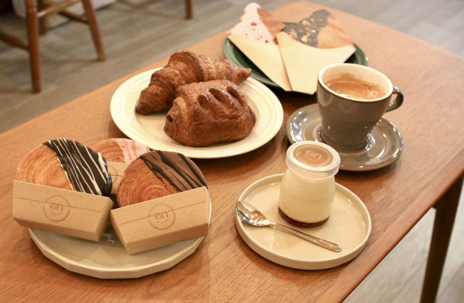 食べ歩きにぴったりなパンやドリンクに加え、プリンなどのスイーツもあり、イートインも可能。クロワッサン生地を円盤形に焼いたenロールは、サクサク生地の中にカスタードやチョコなどのクリームがたっぷり。クロワッサンをプレスして焼き、抹茶やチョコで飾ったクルンジは、歯ざわりが楽しく、思わず写真を撮りたくなる大きさだ。原材料の生クリームは大山乳業(琴浦町)、牛乳は岸田牧場(同)と地元産にこだわり、コーヒーはIGNIS COFFEE ROASTER(湯梨浜町)に頼んだオリジナルブレンド。