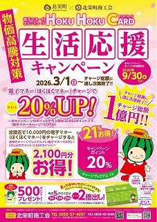 3月1日より、物価高騰対策『生活応援キャンペーン』を実施します。電子マネー(ほくほくマネー)チャージで、ポイント20%が付与されます。通常のチャージプレミアム1%...