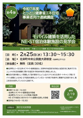 令和7年度 とっとり健康省エネ住宅事業者向け連続講座モバイル建築を活用したNE-ST宿泊体験施設の見学会が北栄町で開催されます。日時:令和8年2月25日(水)13:3...