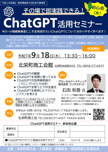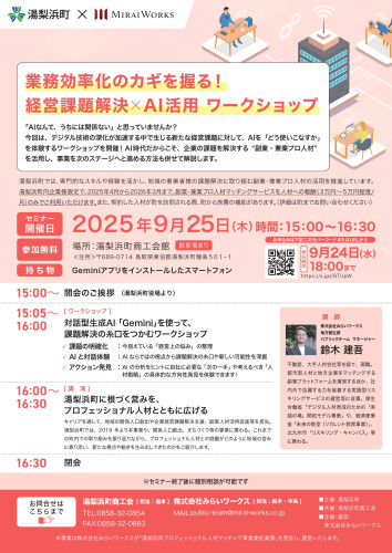 今話題の「生成AI」とは何なのか?小規模事業者が活用できる事例と実践演習を交えながら、ギュッとまとめた内容で分かりやすく紹介します!日 時 10月 9日(木) ...