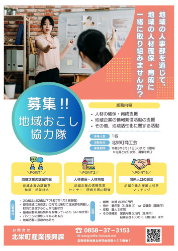 北栄町内の企業の人材確保及び人材育成を目的として立ち上げる「北栄町版地域の人事部」に係る地域おこし協力隊を募集します!地域おこし協力隊の募集の詳細については...