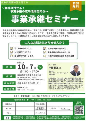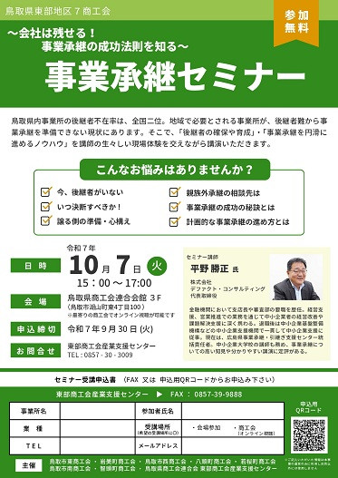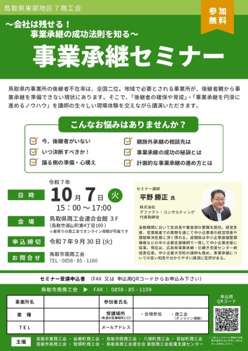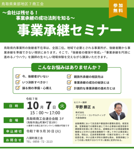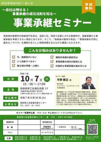 鳥取県内事業所の後継者不在率は、全国二位。地域で必要とされる事業所が、後継者難から事業承継を準備できない現状にあります。そこで、「後継者の確保や育成」「事業...