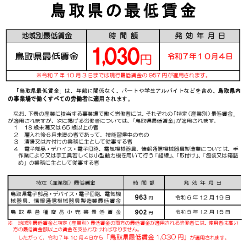 鳥取県の最低賃金は、令和7年10月4日から1,030円になります!最低賃金制度とは、最低賃金法に基づき国が賃金の最低額を定め、使用者は、その最低賃金額以上の賃金を労働...
