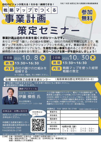 事業計画は自社の未来を描く大切なツールです。本セミナーは「儲け」の仕組みを理解し、自社の方向性を明確にした上で、戦略マップを活用しながらアクションプランを作...