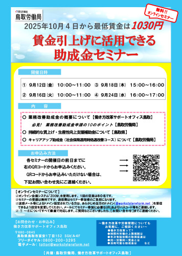 2025年10月4日から鳥取県の最低賃金が1,030円に引き上げられます。賃金引上げを検討中の事業主の皆さまに向けた、業務改善助成金やキャリアアップ助成金など、賃金引上...