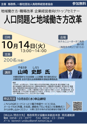 鳥取県では、「若者や女性が働きたい・住みたいと思える鳥取県」を目指して、企業の経営者の方や県民の皆さんと一緒に、誰もが働きやすく、暮らしやすい環境づくりを進...
