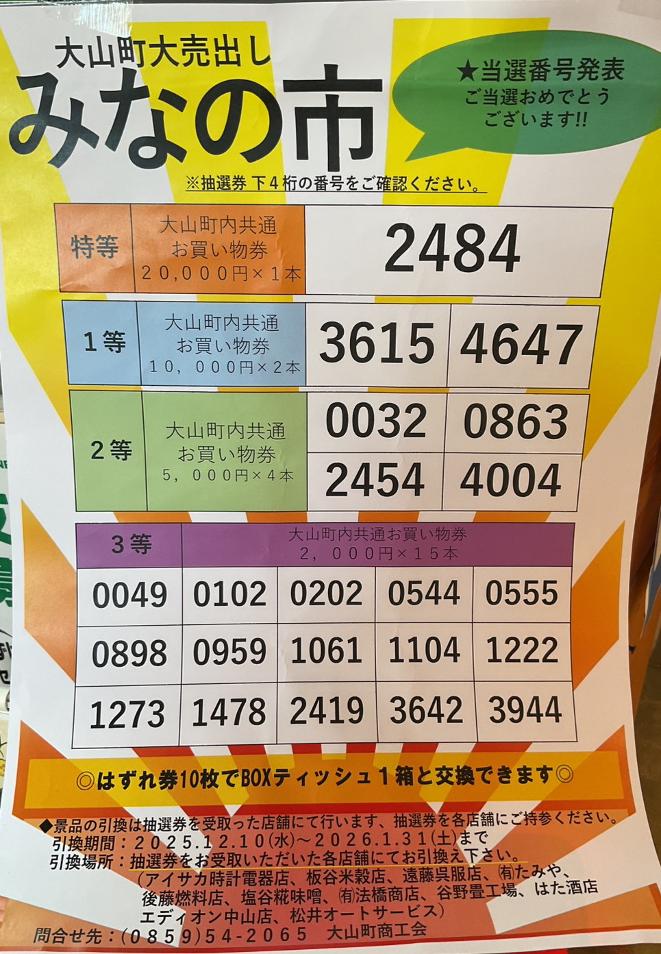 こんにちは、松井オートサービスです。みなの市の抽選結果がでましたのでお知らせさせて頂きます。大山町商工会のHP(https://daisen.tori-skr.jp/info/6556812)にも掲...