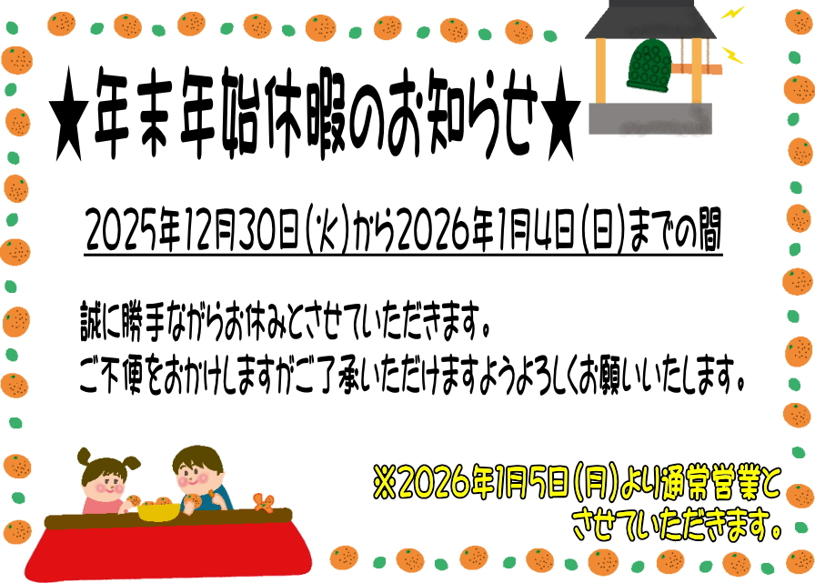 本年中のご愛顧に心より御礼申し上げますとともに明くる年も変わらぬお引き立てのほどよろしくお願い申し上げます2025年12月31日(水)9:00~12:002...
